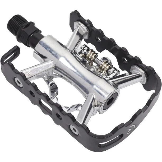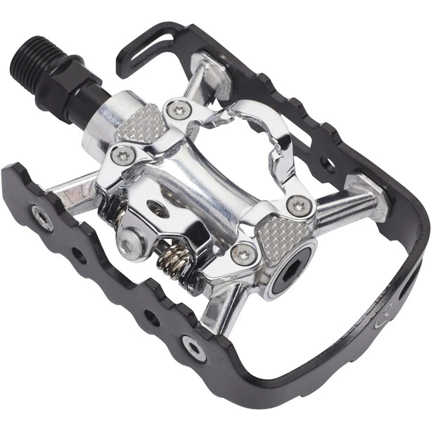 Pédale 2 en 1, compatible SPD, facile à chausser et déchausser, axe Cr-Mo pour une longue durée de vie.