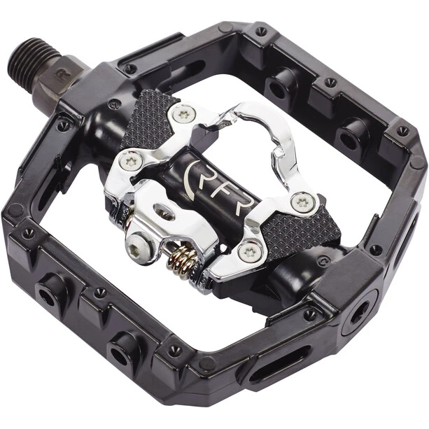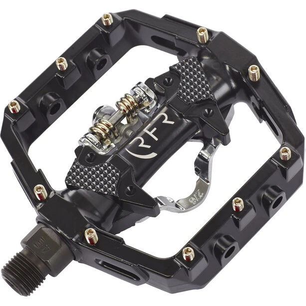 La pédale plate équipée d’un système à clic est compatible SPD et est montée sur un axe Cr-Mo. Les goupilles antidérapantes sont interchangeables et permettent une meilleure adhérence.